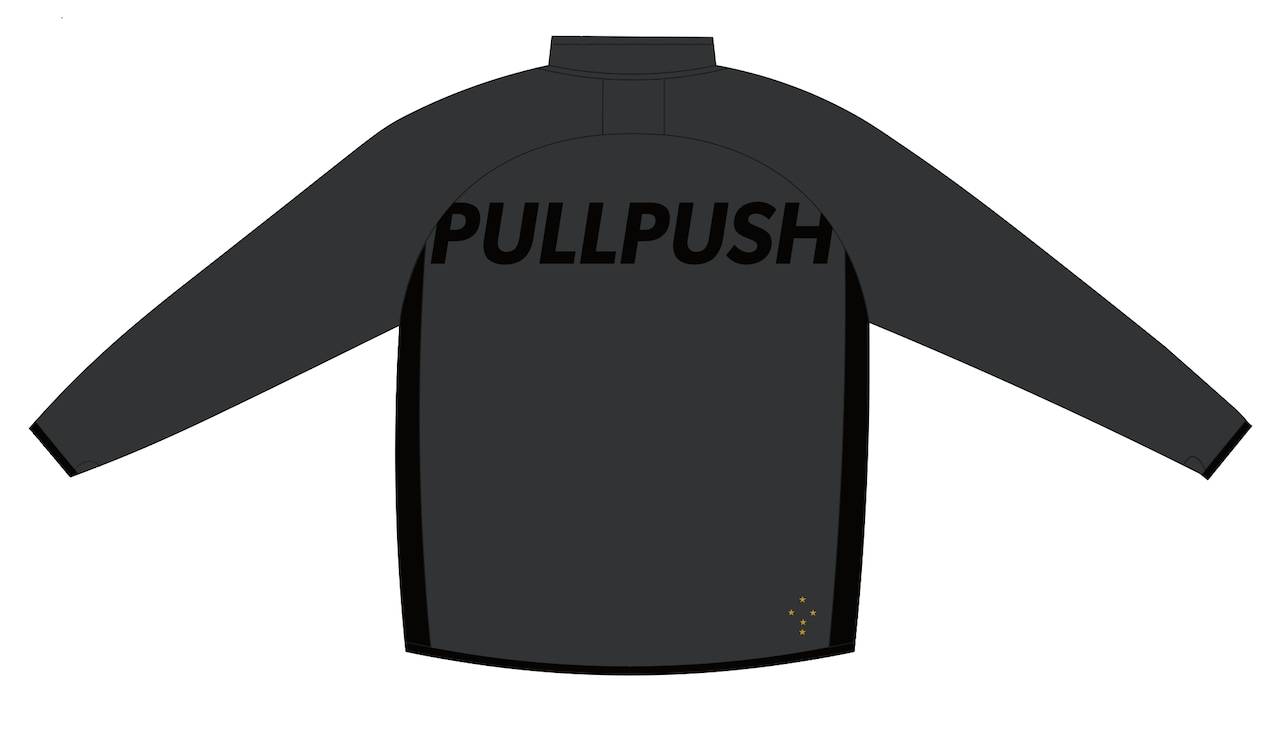 背中にはPULLPUSHのロゴが、どデカくはみ出るデザインで、『枠にとらわれずに突き抜けろ!』というメッセージを表現。