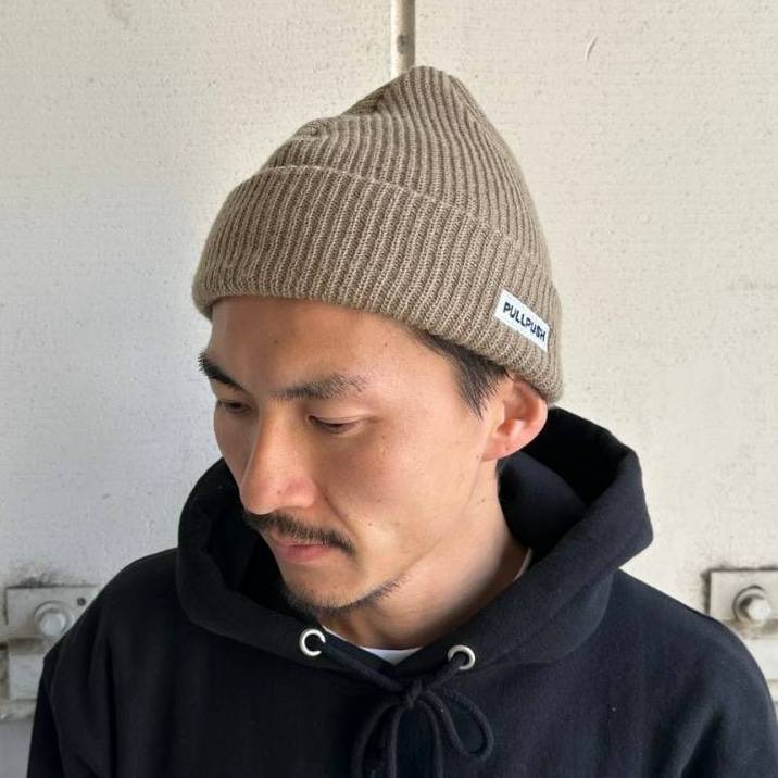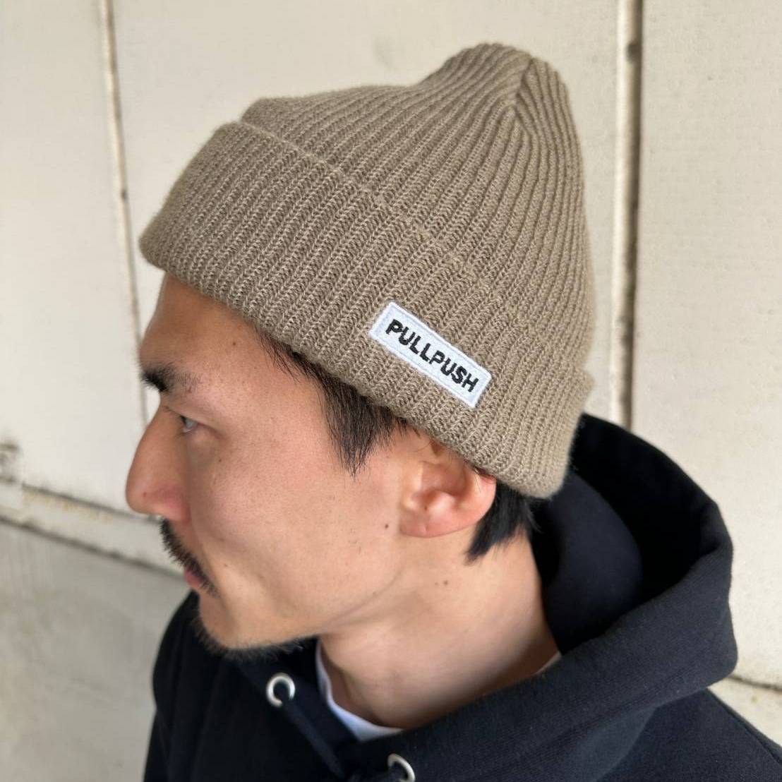 PULLPUSHの刺繍ボックスロゴが入った、やわらかくかぶり心地の良いビーニーです。